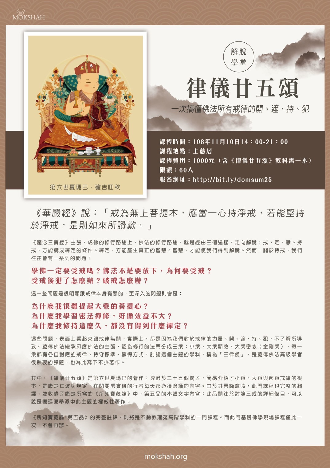 解脫法堂四門必修四門基礎課程之最後一堂—《律儀廿五頌》,將於 2019 年 11 月上課。